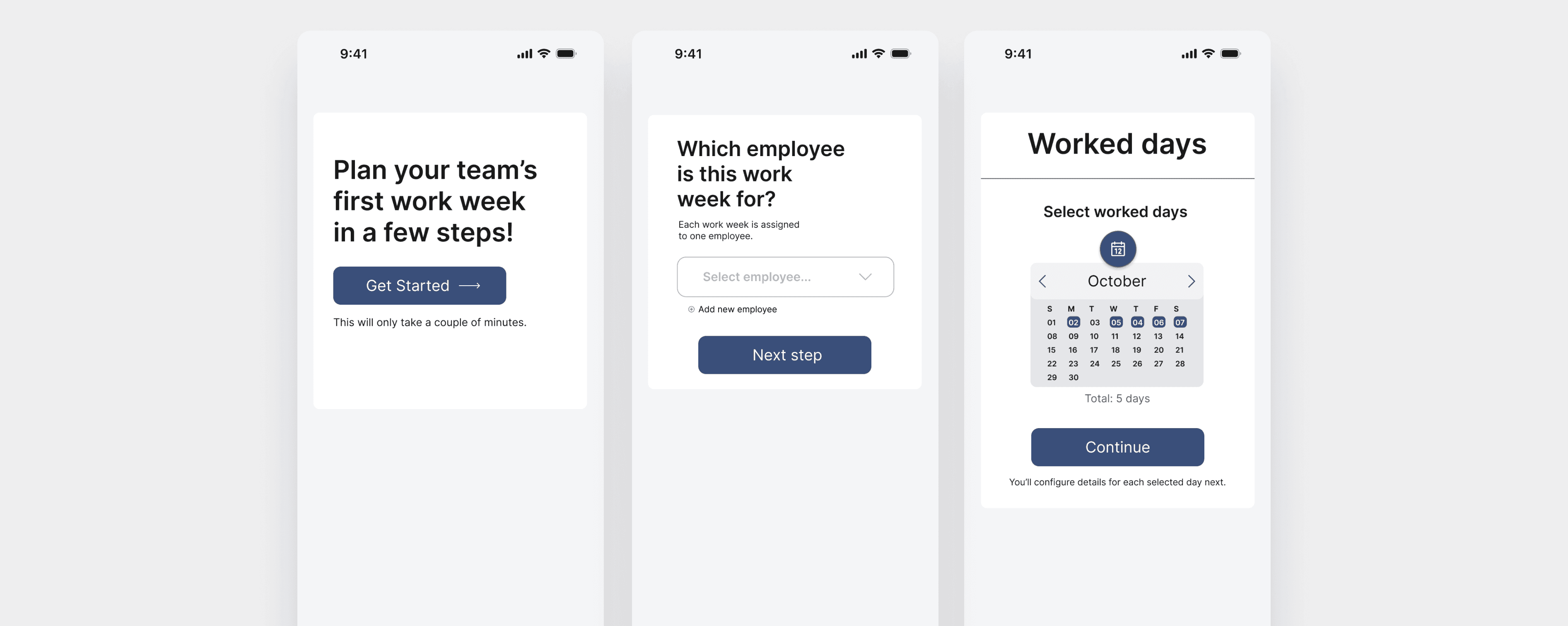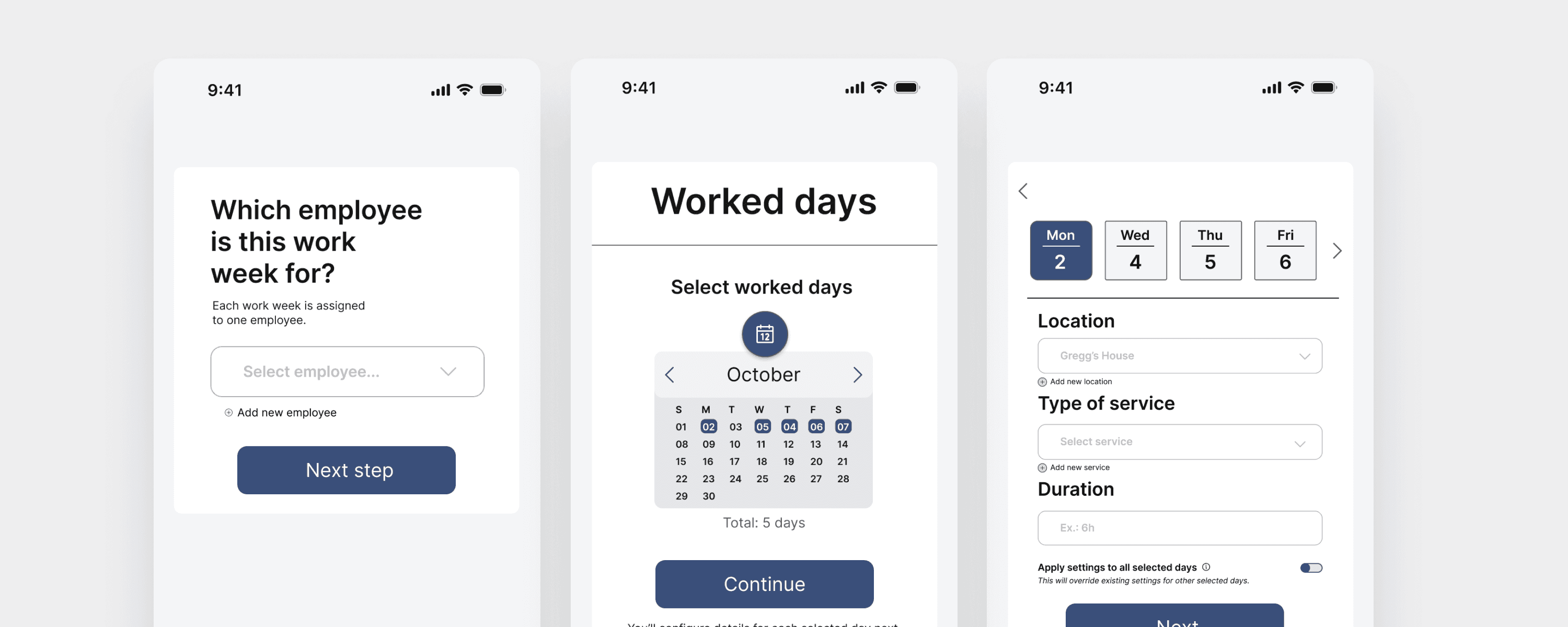 Low-fidelity prototypes guided the transition from a fixed-week model to a flexible workflow where users select worked days and configure details per day.